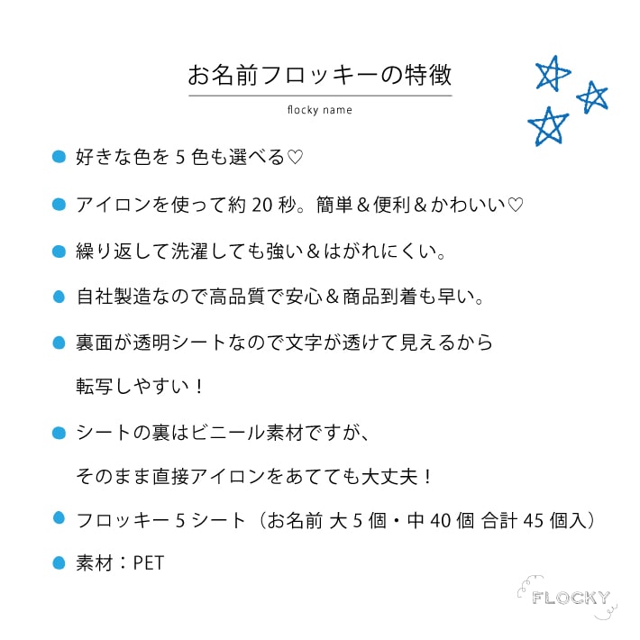 フロッキーネーム 大中セット 45片 送料無料 5色選べる 大容量 お名前フロッキー 名入れ お名前シール 布用 布 洋服 洗濯 プレゼント アイロン お名前シール アイロン シール 転写 靴下 子供 名前 入園 幼稚園 保育園 老人ホーム 介護施設 【楽ギフ_名入れ】only @